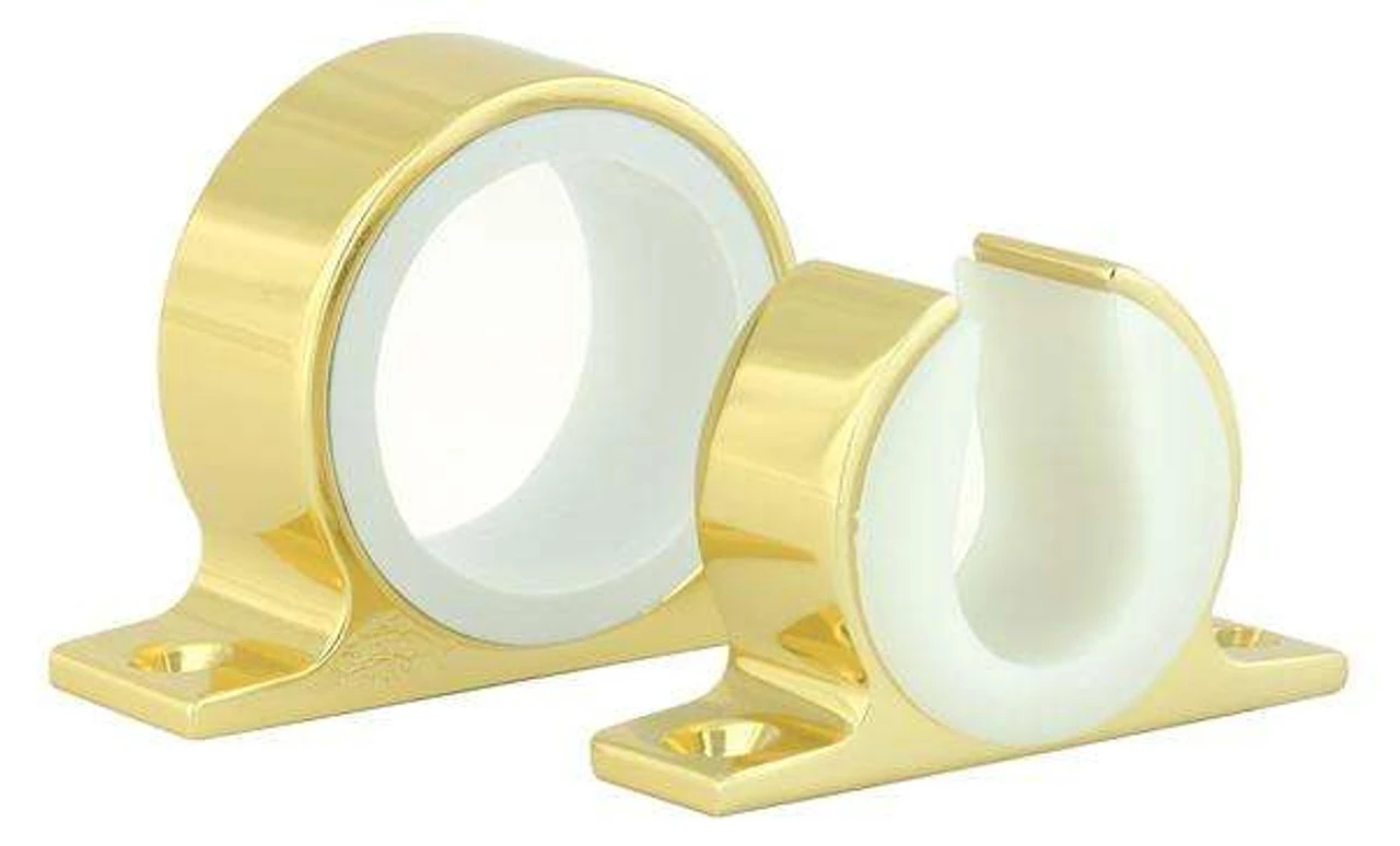 Simple and efficient rod storage. Constructed of Marine Grade Anodized Aluminum with a variety of Anodized Finishes. Rod Butt is inserted into Closed End of set. Vinyl insert protects the Rod Butt. Tip of rod is placed into Locking End of set and Nylon Locking Ring is rotated to lock it in. Will support the heaviest of rods. Can be mounted Horizontally, Vertically or Overhead. Available in Satin Silver, Bright Silver and Bright Gold.