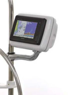 NavPod RailMount RMX4400 Series are best used for mounting of an autopilot control, sailing instrument, or small chartplotter onto an existing pedestal guard. The NavPod RailMount RMX4400 Series fits onto any 1? or 1.25? diameter tube. A Chromed Stainless Steel arm is used to mount a NavPod. The NavPod can rotate 180 degrees for easy viewing while sitting under the dodger on a rainy day. All wire run from the NavPod, down the center of the stainless steel arm, and into the pedestal guard. This application provides a clean and sturdy installation for electronics, without replacement of the pedestal guard.