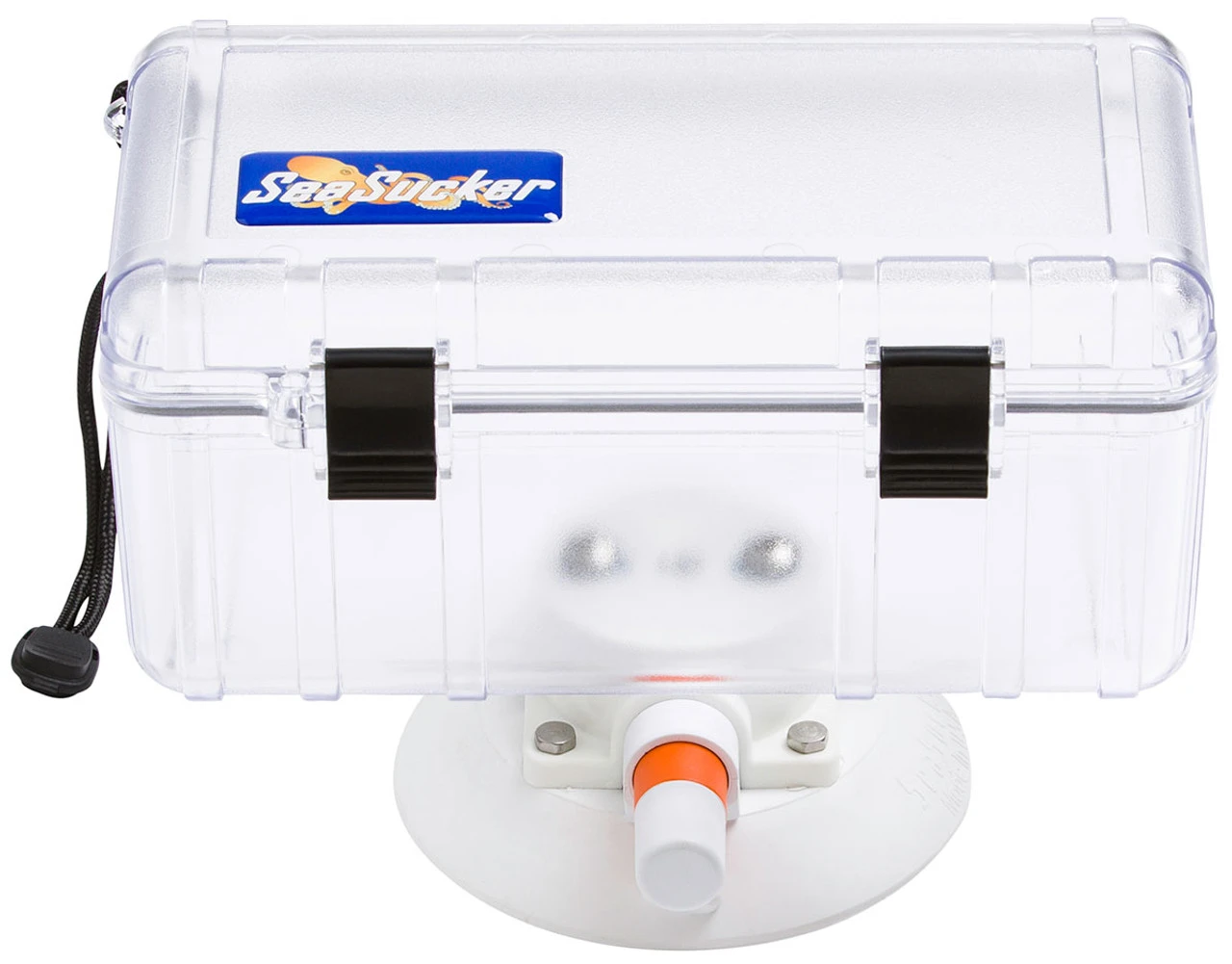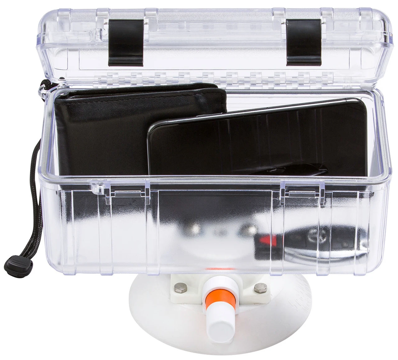You’ll never be short of waterproof storage again – the 7.5″x3.5″x3.5″ (approx) Dry Box is big enough for your wallet, cell phone, camera, cigars, etc. It seals tight to keep water out, and it holds firmly to your dash or other horizontal surface with our powerful 4 1/2″ SeaSucker. Two clips snap tight to keep the lid closed.
